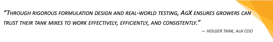 In a world of tight spray windows, unpredictable conditions, and rising performance expectations, broad tank mix compatibility must be a strategic advantage—not a liability. AgX helps you get there.