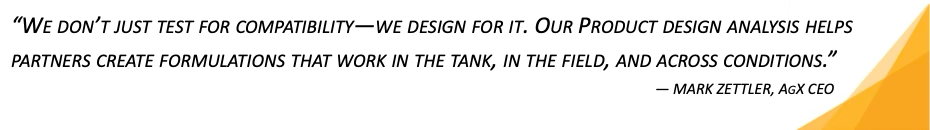Through its collaborative Product Design Analysis process, AgX works with partners from early-stage concept refinement through lab validation, field testing, and commercial rollout. Their team evaluates how formulations behave across tank mixes, application systems, and environmental conditions—including drone and ULV platforms. By modeling real-world variables and designing for compatibility from the start, AgX helps clients anticipate challenges, reduce variability, and deliver products that perform where it matters most
